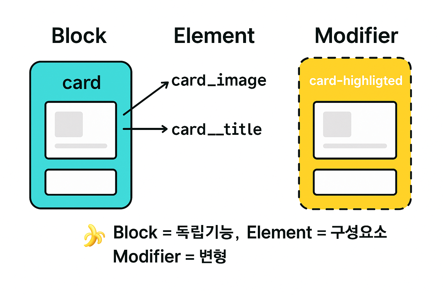 쉽게 말하면, "큰 덩어리(Block) → 내부 구성요소(Element) → 변형(Modifier)" 이런 식으로 클래스 이름을 체계적으로 짓자는 거죠.🍌 BEM 네이밍 규칙